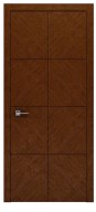 Глухі дверні полотна оздоблені натуральним шпоном, який демонструє природну красу деревини. Стриманий декор створений виключно завдяки вставкам із різним напрямком розташування волокон – горизонтальним і вертикальним. Завдяки дизайнерському задуму і відсутності інших декоративних елементів, лаконічність малюнка набуває посиленої виразності, підкреслює статусність і поважність загального стилістичного рішення інтер’єру.